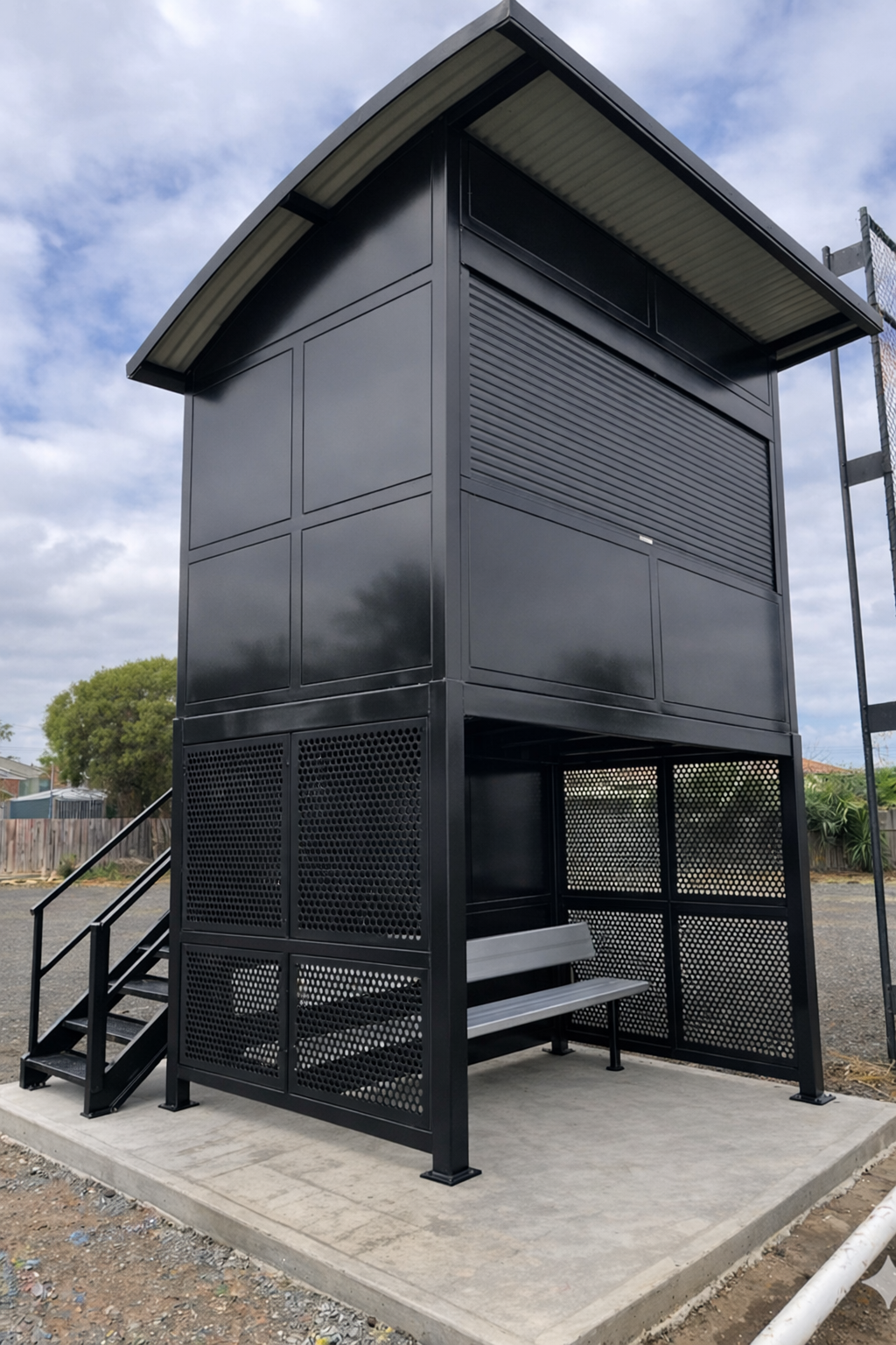 Elevate your game-day perspective with the Western Series Two-Storey Scorers’ Shelter. Engineered with a heavy-duty galvanised steel frame and a Colorbond roof, this elevated structure provides an unobstructed, high-vantage view for officials. The design features a colour-matched roller window for all-weather protection and is finished in your choice of a standard Dulux powder coat colour. Designed for permanent bolt-down installation to a concrete pad, this dual-level box combines safety with functional design.